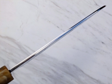 Aogami Stahl ist nicht rostfrei, daher ist die Pflege besonders wichtig. Nach Benutzung mit lauwarmen Wasser säubern und gründlich abtrocknen. Bitte achten Sie beim Schneiden von säurehaltigen Lebensmitteln darauf, das Messer sofort zu reinigen und gelegentlich die Klinge mit etwas Kamelienöl leicht einzuölen. Die Klinge läßt sich sehr gut nachschleifen und behält lange Zeit ihre Schärfe. Klingen aus handgeschmiedetem Aogami sind fast die schärfsten Klingen der Welt. 19,5 cm Klingenlänge, Gewicht ca. 264 g, nicht rostfrei, Blattstärke verjüngend von 4 auf 2 mm, Spiegel polierter Rücken, Klinge in Santokuform, einseitiger Anschliff (rechts), Griff aus achtkantigem Ebenholz, Zwinge aus Büffelhorn (hell bis dunkel).