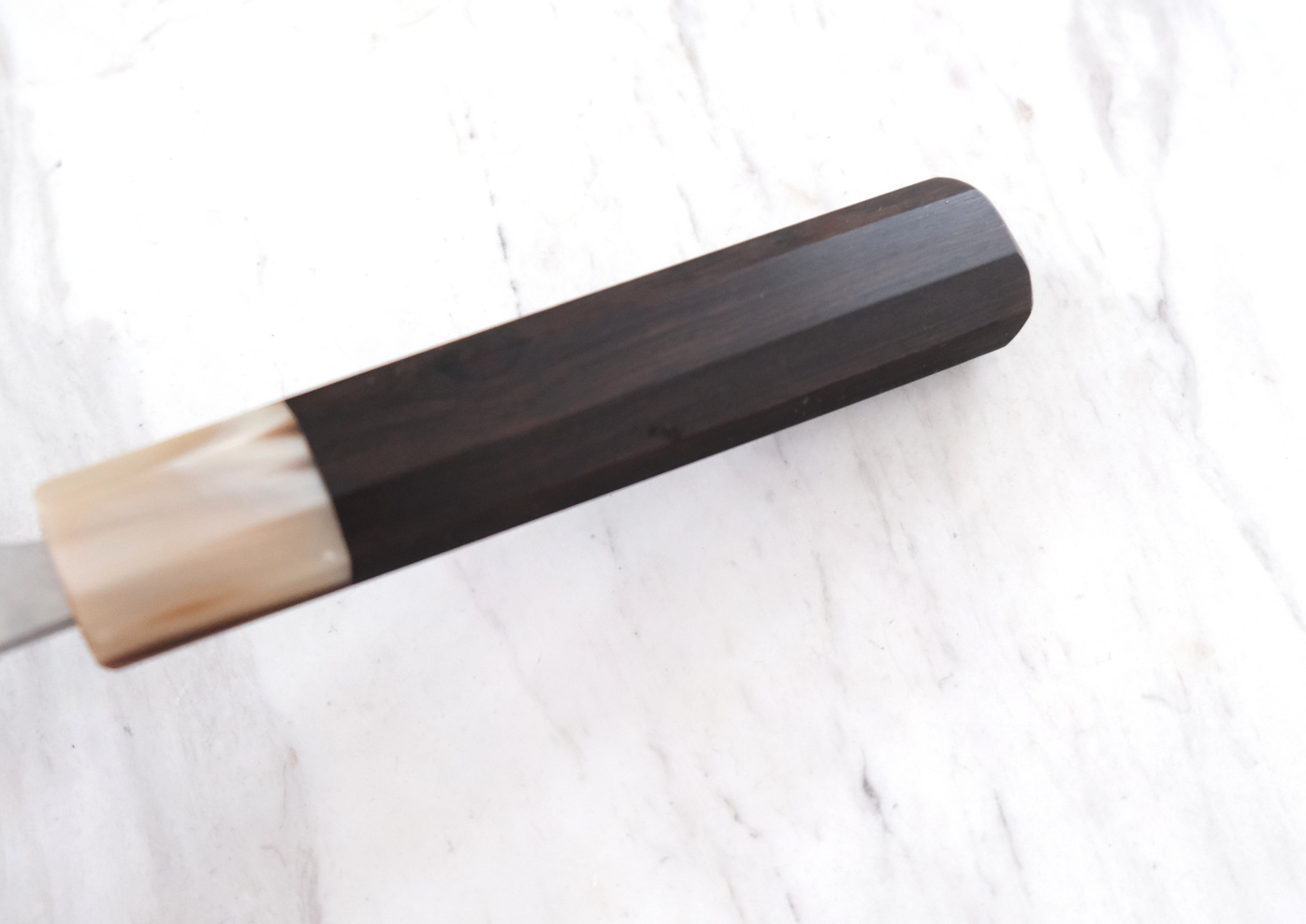 Gyuto, handgeschmiedet, ca. 25 cm Klingenlänge, Blattstärke 3,7-2,7-1,6 mm, polierte Klingenoberfläche, 33 Lagen VG10 Damaststahl, beidseitiger Anschliff, Gewicht 226 g, rostfrei. Mittellage aus VG10 hergestellten, äußerst hartem und verschleißfestem Sinterstahl, HRC63, achtkantiger Ebenholz-Griff mit heller Büggelhornzwinge, Klingenrücken und Klingenansatz poliert. Dieses Gyuto ist für Rechts- und Linkshänder empfehlenswert. Eindrucksvolles welliges Damastmuster. Extrem scharf, sehr gute Schnitthaltigkeit. Beeindruckendes Allzweckmesser für Haushalt und Gastronomie.