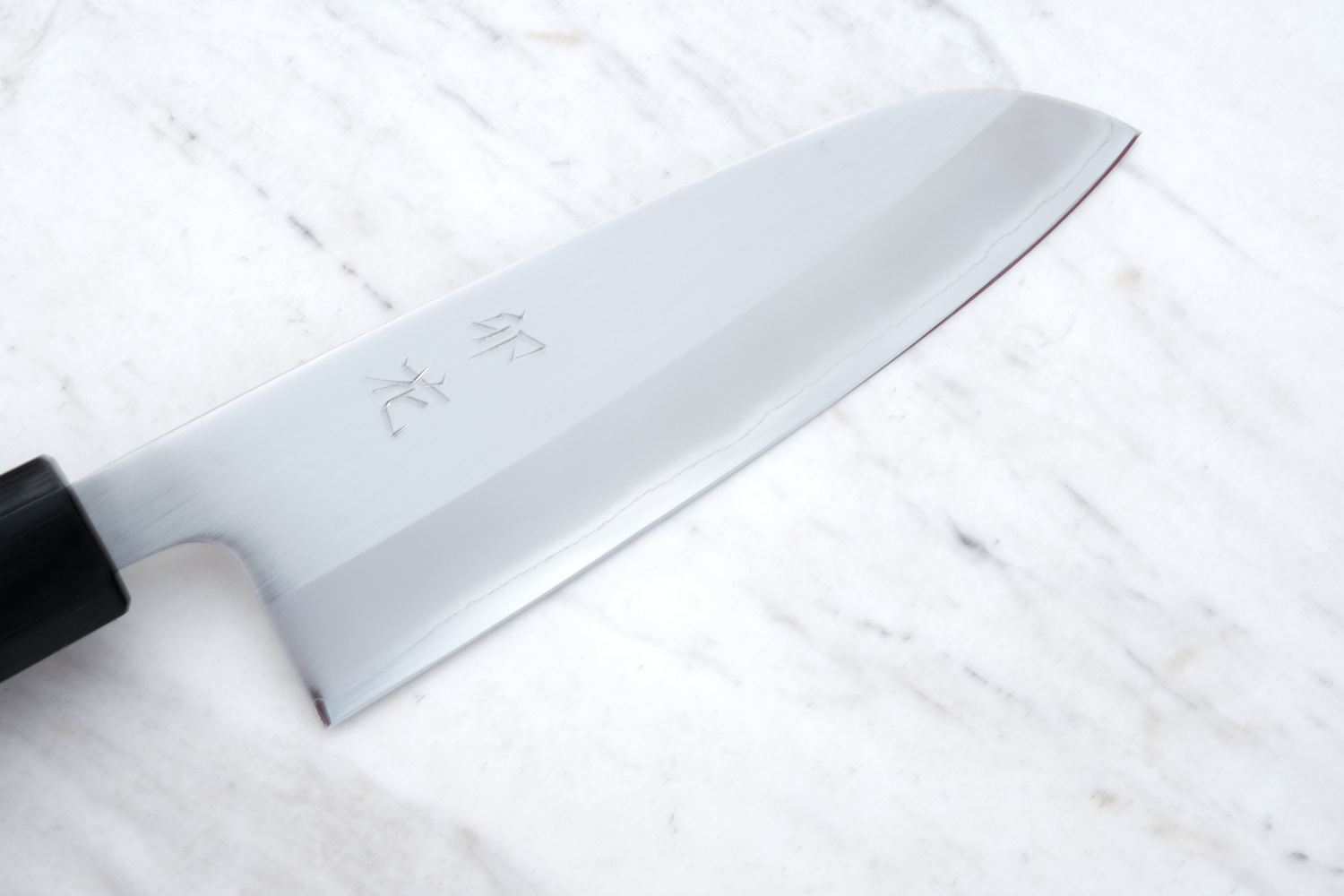 Shirogami 1 gehört zur obersten Yasuki-Klasse mit einem Karbongehalt von C1.3 %. Shirogami 1-Stahl ist nicht rostfrei, daher ist die Pflege besonders wichtig: Nach Benutzung mit lauwarmen Wasser säubern und gründlich abtrocknen. Bitte achten Sie beim Schneiden von säurehaltigen Lebensmitteln darauf, das Santoku sofort zu reinigen und gelegentlich die Schneide mit etwas Kamelienöl einzuölen.