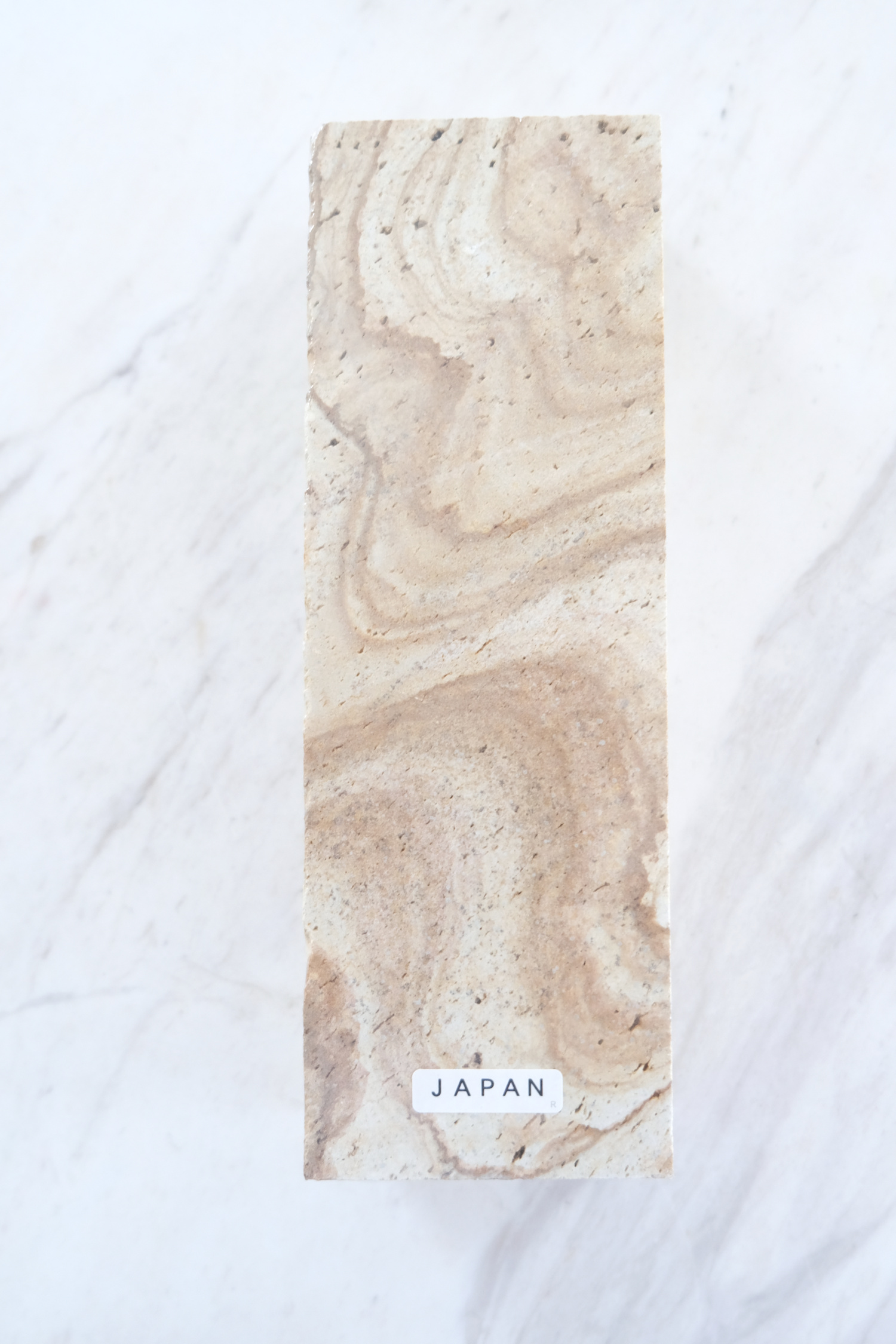 Amakusa Naturschleifstein aus Amakusa/Japan, Körnung etwa 600-800 Größen ca. 205 x 70x50 mm, Gewicht ca 1,7 kg. Amakusa Naturschleifsteine sind für den Grundschliff zu verwenden. Während des Schleifvorganges verkleinern sich die Schleifpartikel zu einer Sandige Schleifpaste. Aoto oder Mikawa nagura als Tomonagura verwendebar,dann es entsteht das typisch wolkige Naturstein-Finish und bissige Schärfe! top Qualität ! Mittel Hart.