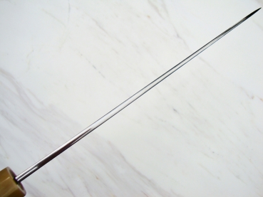 Wa Gyuto mit Warikomi, handgeschmiedet, 27 cm Klingenlänge, Blattstärke 4 bis1,8 mm, Aogami-2, beidseitiger echter Hon Kasumi Anschliff, sehr feines Finish, mine, ago und Schneide spiegelpoliert, Gewicht 250 g, nicht rostfrei, HRC ca. 63-65. Hier wurde kein Fertigmaterial benutzt, sondern die mittlere Karbonstahlschneidlage wurde per Hand eingesetzt und geschweißt. Der Rokaku-Hanmaru-Griff (feinste Griffform) oben sechskantig - Unterseite halbrund, aus dem hochwertigen Kernstück des Ho-Holzes hergestellt, mit polierter Zwinge aus Wasserbüffelhorn, liegt Rechts- wie auch Linkshändern gleichermaßen angenehm in der Hand. Erleben Sie mit diesem Messer was Karbonstahl ausmacht! Mit diesem handgeschmiedeten und -signierten Gyuto erhalten die Sie ein absolutes Liebhaberstück, welches Sie nicht mehr aus der Hand geben möchten.