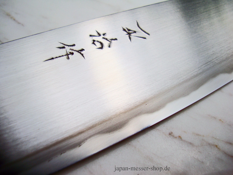 Für die Außenlage der Klinge wurde weiches japanisches Eisen mit der Schneidmittellage aus Atsuraeko-Iwasaki-Stahl sorgfältigst von Hand in Sanmaiuchi-Verfahren feuerverschweißt. Der Honbazuke-Abzug der Klinge wurde in mehreren Arbeitsgängen von Hand auf Naturschleifsteinen aufgebracht.