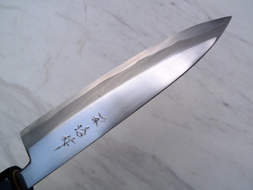Für die Außenlage der Klinge wurde weiches japanisches Eisen mit der Schneidlage aus Iwasaki Stahl sorgfältigst von Hand feuerverschweißt. Iwasaki Stahl enthält einen höheren Karbonanteil und sehr erfahrenen Schmieden verarbeitet. Die extrem scharfe Klinge behält lange Zeit ihre Schärfe. Das matte längs geschliffene Finish der Klinge und der Honbazuke Abzug der Schneide sind das Ergebnis mehrerer Schleifphasen mit Naturschleifsteinen. kommt dem Finish einer Schwertklinge sehr nahe und wurde genauso wie beim Schwertschleifen gearbeitet.