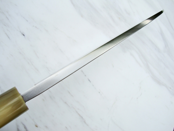 Rasiermesserscharfe Schneiden, sehr gute Schnitthaltigkeit. Alle traditionell japanischen Messer erreichen höchste Schärfe durch optimalen Schliff nur auf japanischen Wassersteinen.