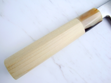 Rasiermesserscharfe Schneiden, sehr gute Schnitthaltigkeit. Alle traditionell japanischen Messer erreichen höchste Schärfe durch optimalen Schliff nur auf japanischen Wassersteinen.