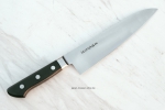Gyuto, Klingenlänge 24cm, beidseitiger Anschliff, Gewicht 230 g, Blattstärke 2mm, Griffschalen aus schwarzen POM Kunststoff, dreifach genietet, sehr handlich, geeignet als Allzweckmesser.