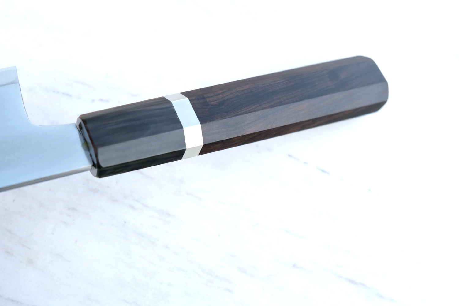 Aogami Sanmaiuchi Gyuto 24 cm Klingenlänge, geschmiedet aus Tamahagane, Gewicht 267 g, Schneidmittellage Aogami 2 (nicht rostfrei), Außenlagen Eisen (nicht rostfrei), HRC mehr als 63, dreilagige handgeschmiedete Klinge im Migaki finish, Blattstärke ca. 4,1 mm (Nakago) verjüngend zur Klingenspitze auf ca. 4,1 bis 2,1 mm, beidseitiger Anschliff für Rechts- wie Linkshänder optimal, Klingenrücken abgekantet, Griff aus achtkantigem Ebenholz (naturbelassen, fein geschliffen) mit echter Büffelhornzwinge.